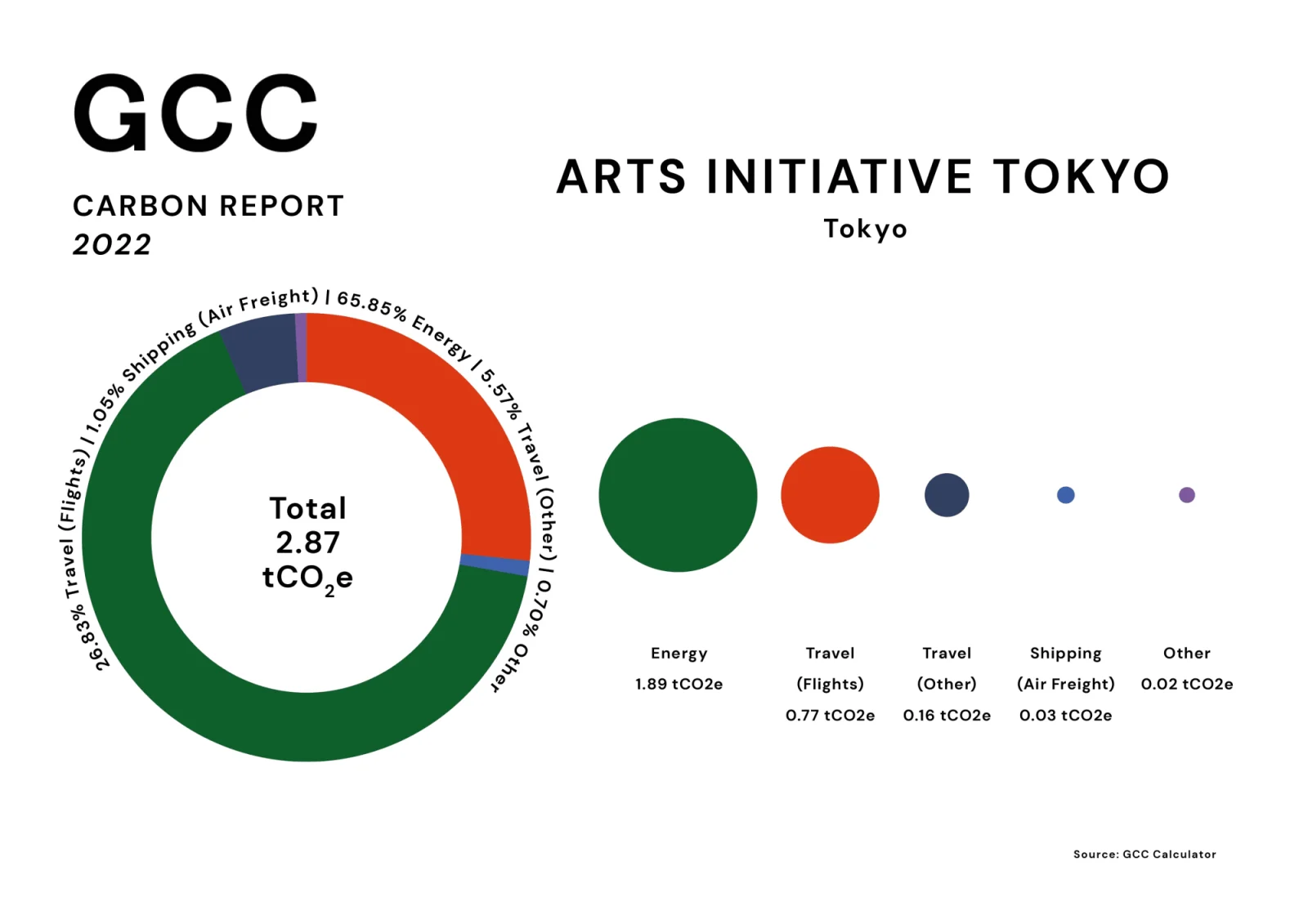 さらに前回の勉強会でも紹介されたカーボン・カリキュレーターは、個別の実態を細かく把握するツールとしてGCCが開発し、オンラインで無料公開している。組織の1年間の活動に沿って項目ごとに入力していくと炭素排出量が測定され、自分たちの活動のどの部分が多くの排出量を占めているかが明確にグラフで示される。状況を正しく把握することで、初めて目標が定まり効果的なアクションがとれる。GCCの実践的な姿勢がよく現れている。