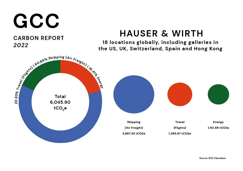GCCが生まれたのは、コロナによるロックダウン寸前のこと。トーマス・デーン、リッソン等のギャラリストや、フリーズ・アートフェアのディレクターらが集まって、脱炭素化に向けたガイドがアート業界に存在しないことについて話し合ったことが始まりだった。まず取り組んだのが、それぞれの炭素排出量の調査。それにより、スタッフの移動(travel)、作品輸送(shipping)、スペースの光熱費(energy)、この3つがアート業界の主な排出源であることが明らかになったという。