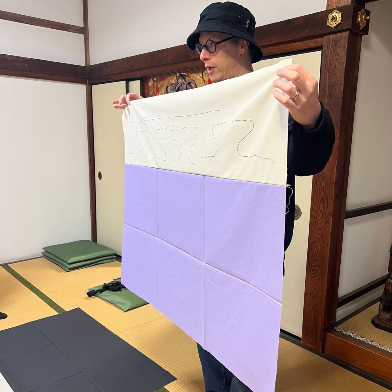 レジデンスで滞在中、私は近隣で見つけたテキスタイルを組み合わせて新たな作品を制作しました。今回の重要な発展として、布の販売者によって残された格子状の折り目を、構造的な要素として敢えて作品に取り入れました。これらの偶然の折り目は、美的要素であると同時に、保管や輸送のための実用的な解決策でもあり、その格子模様の考察は、時間と空間を整理する日本的な概念と共鳴しています。