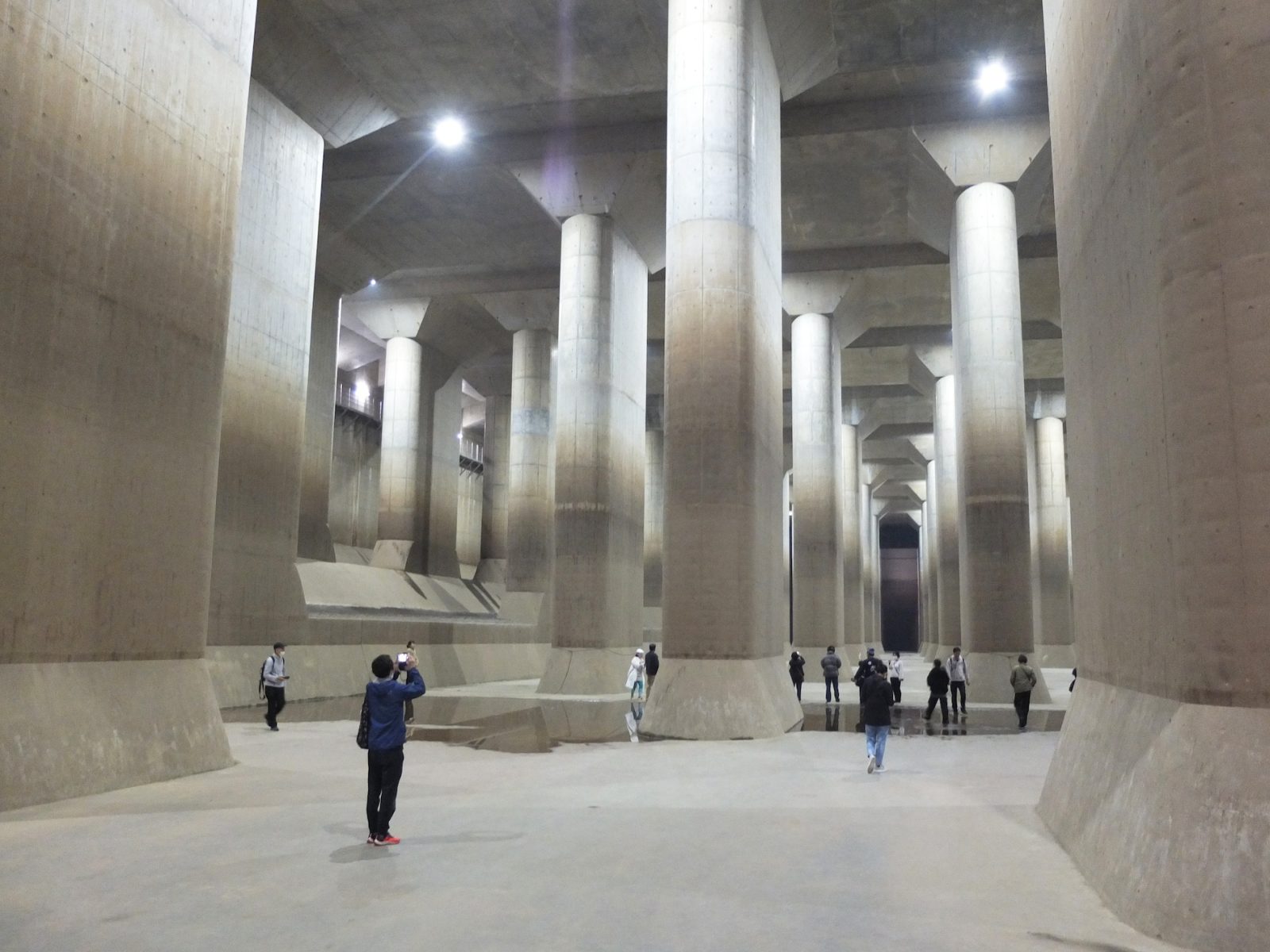 東京の治水について理解を深めるために、埼玉県にある「首都圏外郭放水路」を訪れました。この施設は世界最大級の地下放水路で、大雨や台風時に川の水が溢れないようコントロールするためのものです。小さな川が氾濫しそうになると、余分な水は自由の女神がすっぽり入るほどの巨大な立坑に流れ込み、そこから地下トンネルを通って「地下神殿」とも呼ばれる調圧水槽へと運ばれ、最後には江戸川へと排出されます。人間の手による技術と自然の力との繊細なバランスを感じる、圧巻の光景でした。
