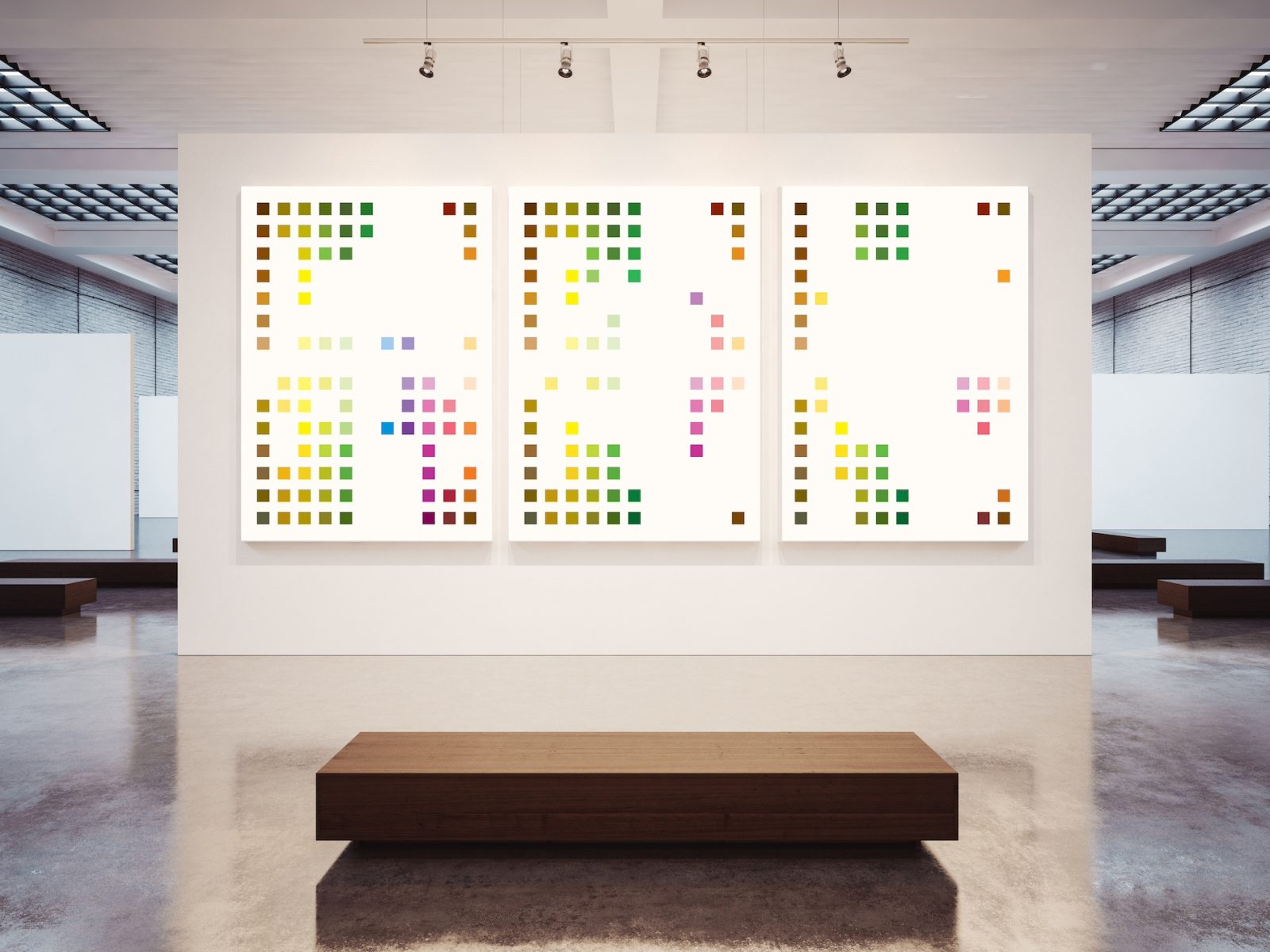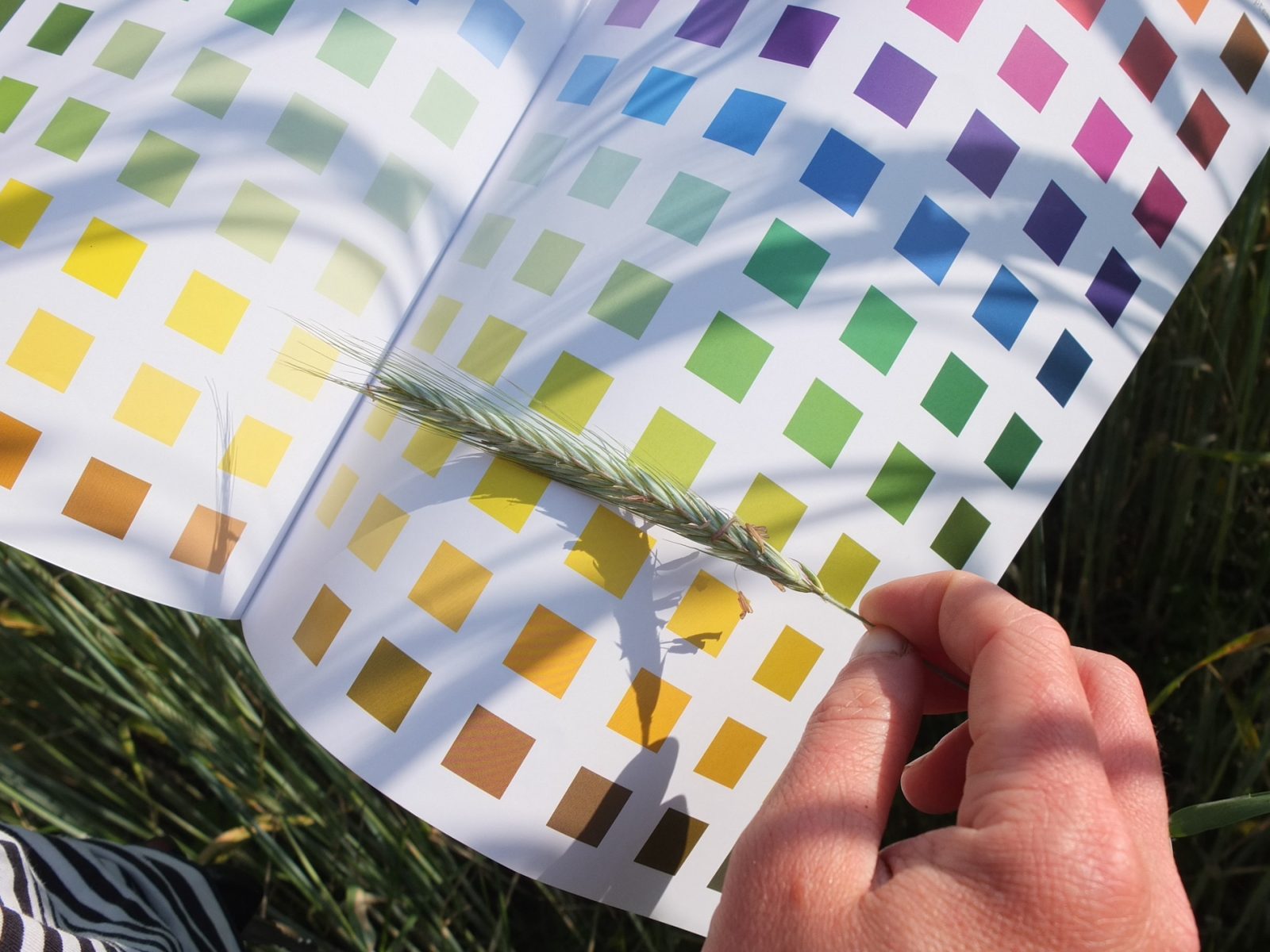 この「自然と人との関係性」に注目した視点は、もう一つのプロジェクト《Garden Journal Through Colour》にも反映されています。オランダや日本の水管理のように、自然の力を読み取る知恵が色彩にも現れると考え、庭園や公園、風景の色の移り変わりを1年かけて記録しました。観察をもとに、季節の変化を色のバナーにまとめ、視覚的なアーカイブとして残しています。東京滞在中は、都内外の23ヶ所の庭園や公園を訪れ、その時々の色を記録し、色のコードを作成しました。たとえば、オランダ大使館の庭、東京国立博物館庭園、清澄公園、六義園など。