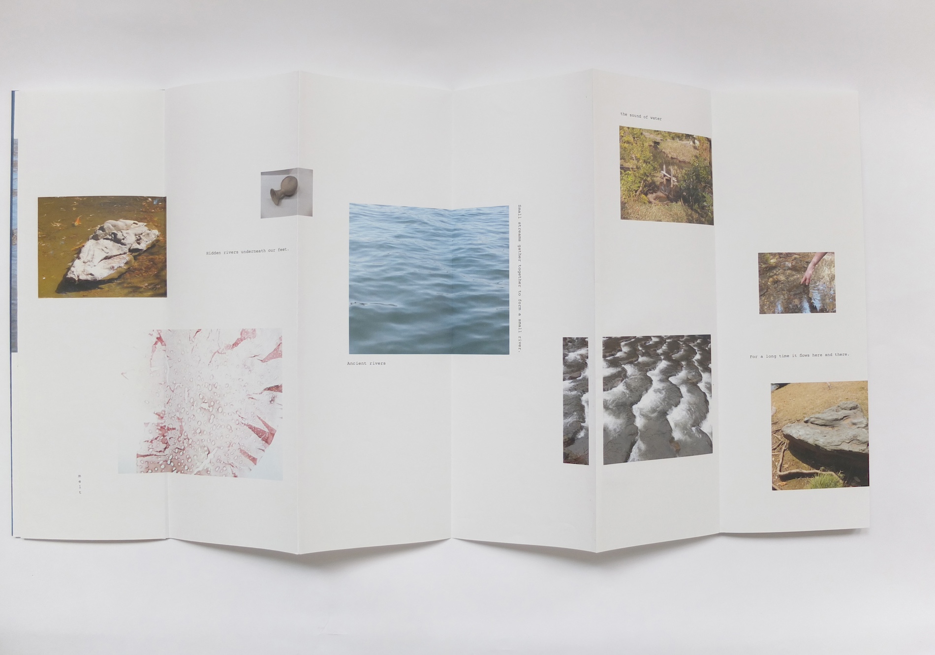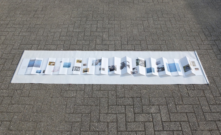 滞在中は、自分の感覚を刺激したモノや素材、瞬間の記録として写真を撮りました。これらは視覚的なメモのようなもので、色や質感、形などが残されています。また、本や展覧会、会話の中で出会った言葉も集めました。こうして写真とテキストが合わさった小さなアーカイブができあがり、私の思考と制作に静かに影響を与えていきました。この素材は、最終的に3メートルの長さに広がる一冊の本としてまとめられ、レイヤー状のリサーチのプロセスを空間的に感じられる形に仕上げました。