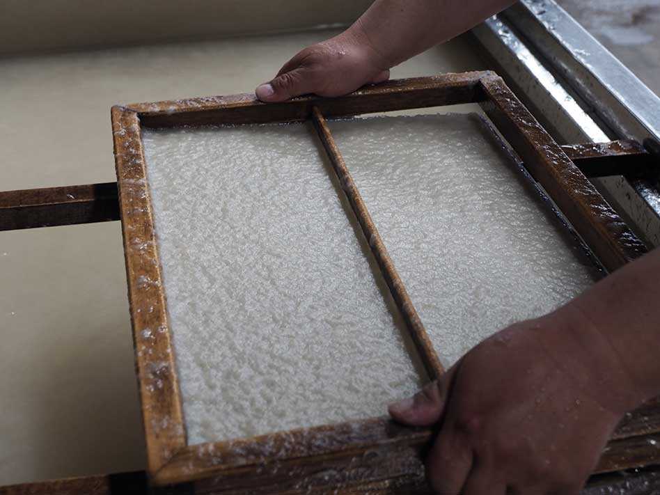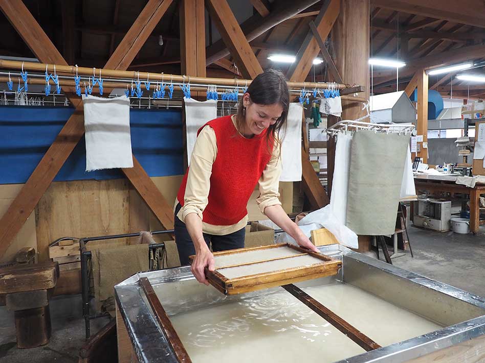 このリサーチと並行して、日本の伝統工芸の中でも特に川の水が重要な役割を果たすもの、たとえば着物の染色や和紙作りにも注目しました。特に自然の水の清らかさと流れが必要とされる点に惹かれました。埼玉県にある「和紙の里」で行われた紙漉きワークショップに参加し、地元の水や繊維、何百年も受け継がれてきた技術がひとつになって紙が生まれる様子を体験しました。水を「管理するもの」だけでなく「協働する存在」としてとらえる感覚が、より深く身体で理解できました。