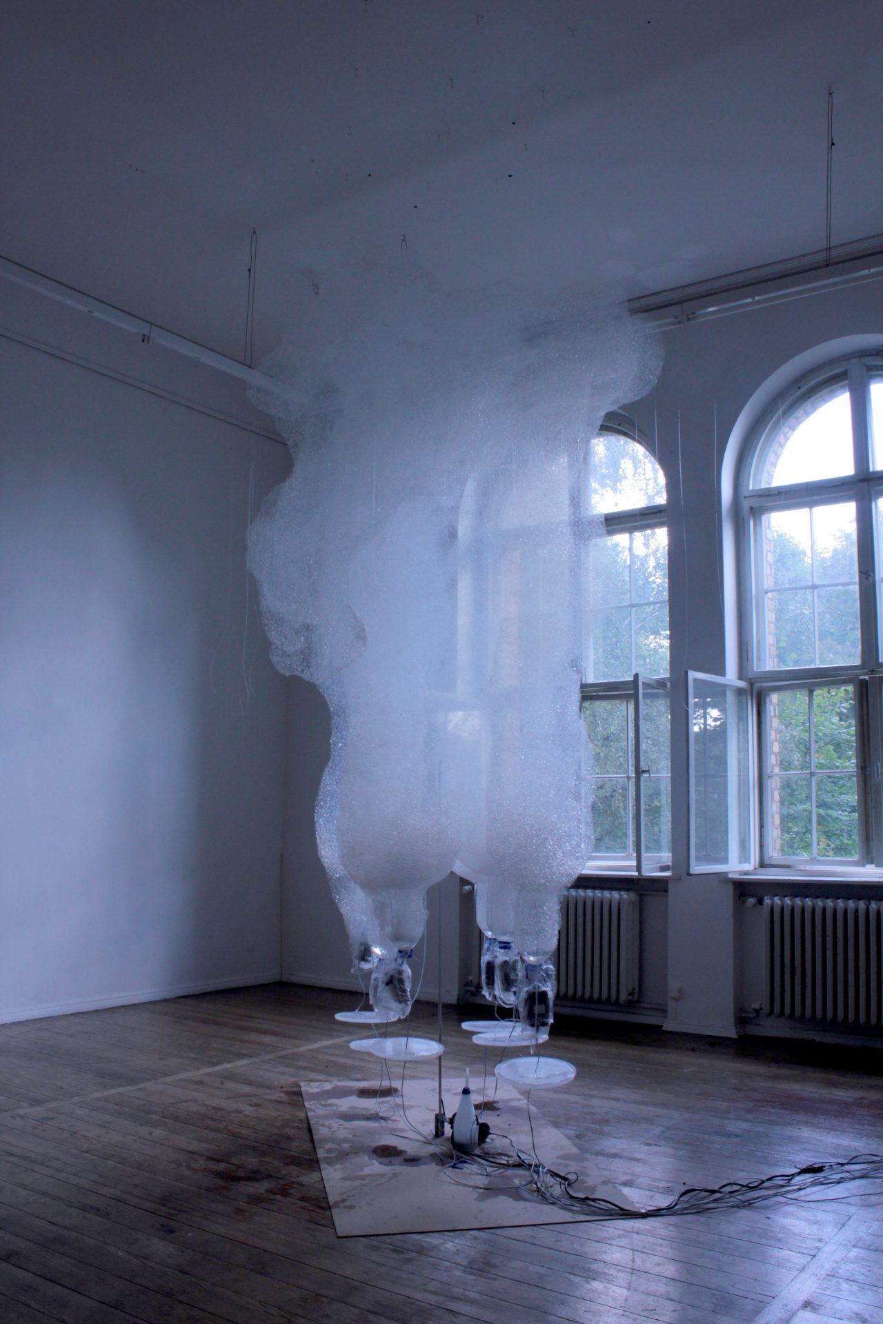 また、自然現象自体に興味を持ったことをきっかけに制作した作品の中には、空気中の湿度を凝結させて氷や水滴に変化させるものも。これは展示空間にどれだけ水分が存在するか、ゆっくりと可視化させたもので、2018年の関西での水害経験から生まれたのだといいます。