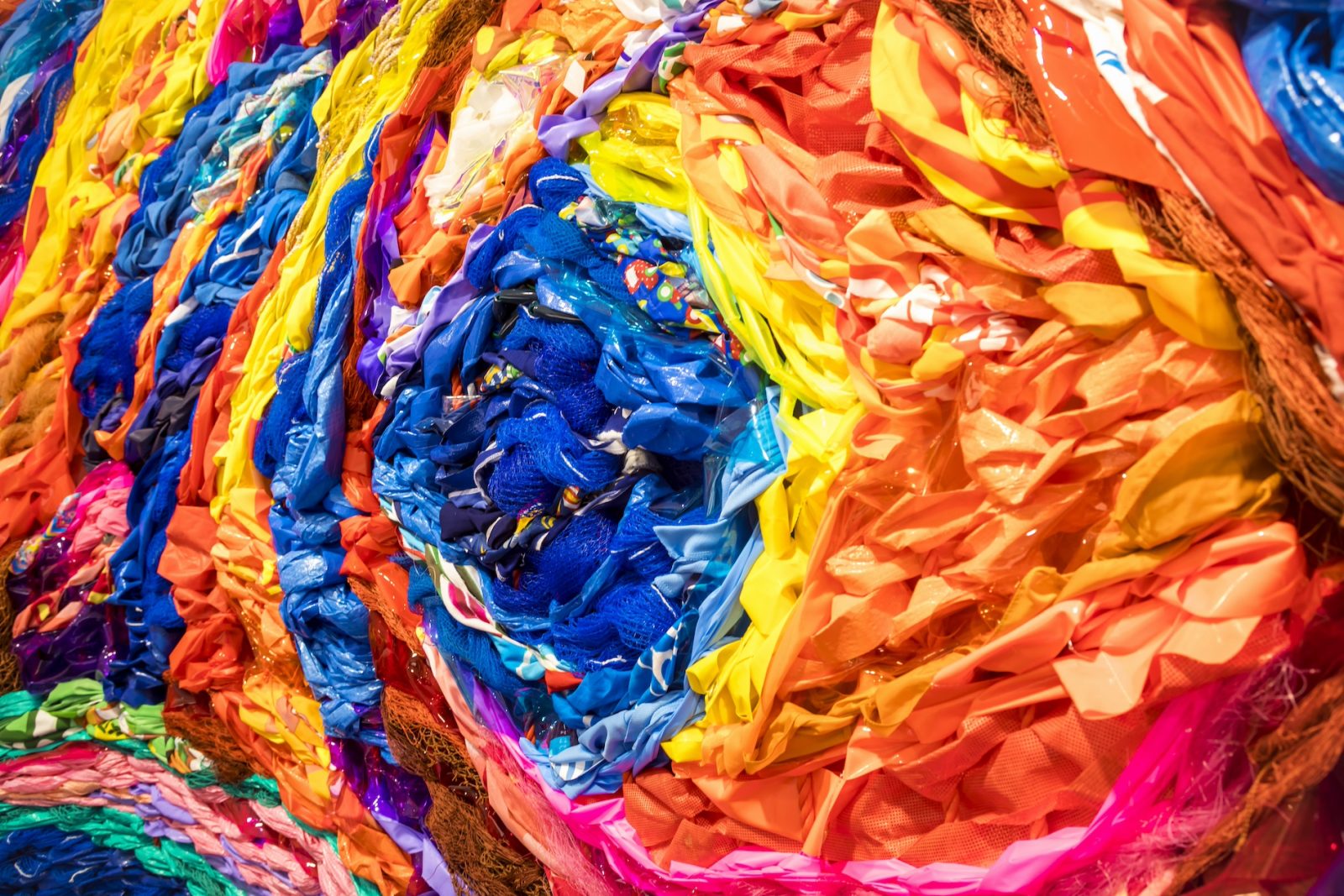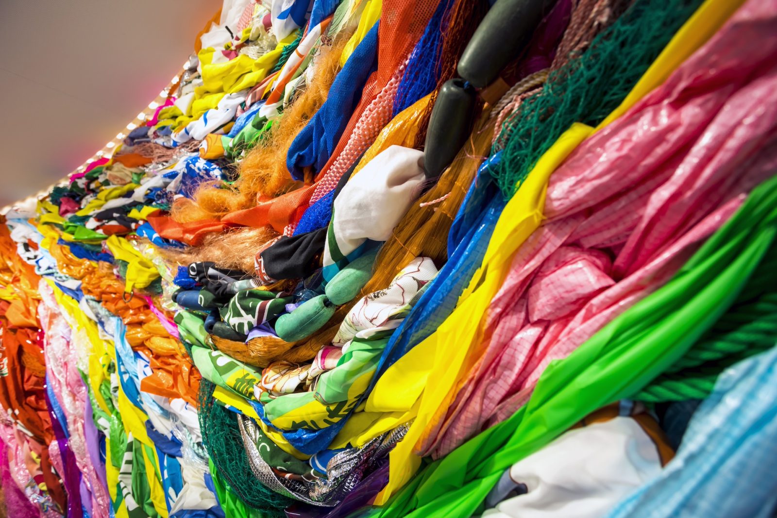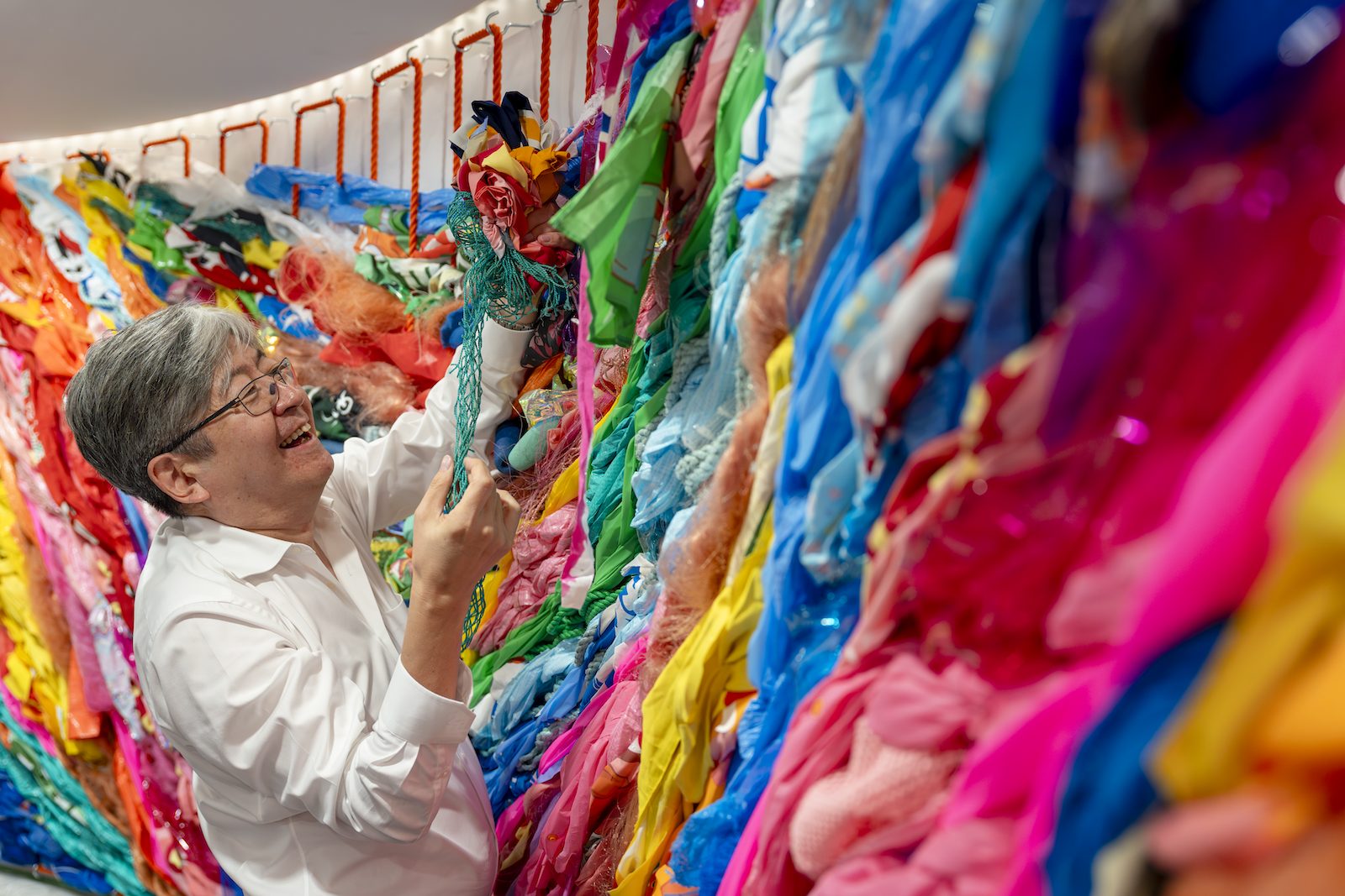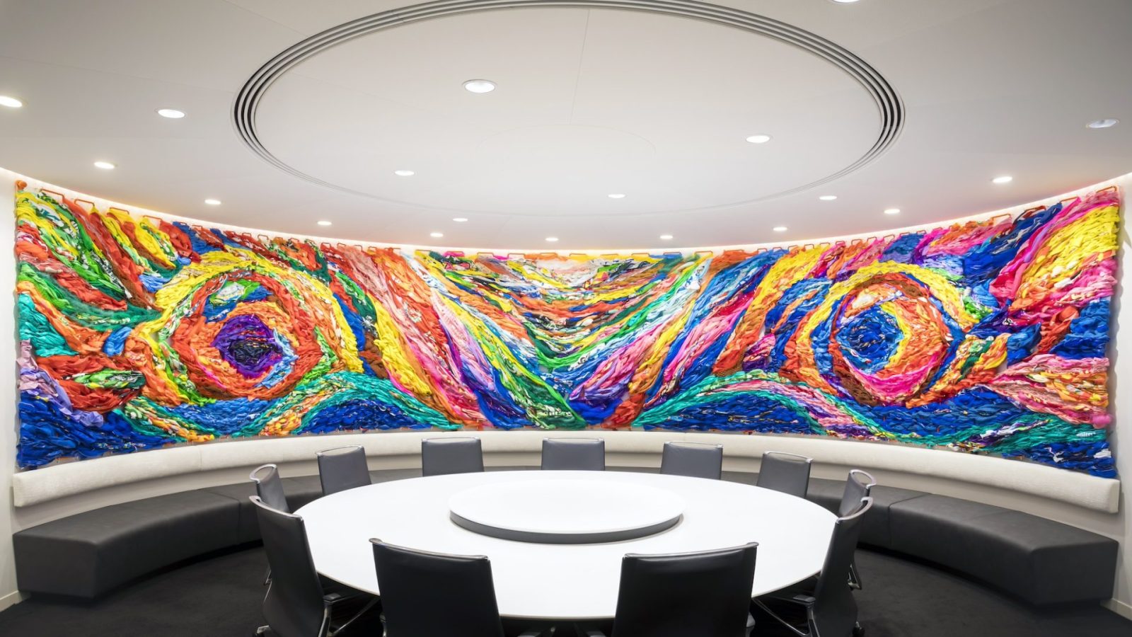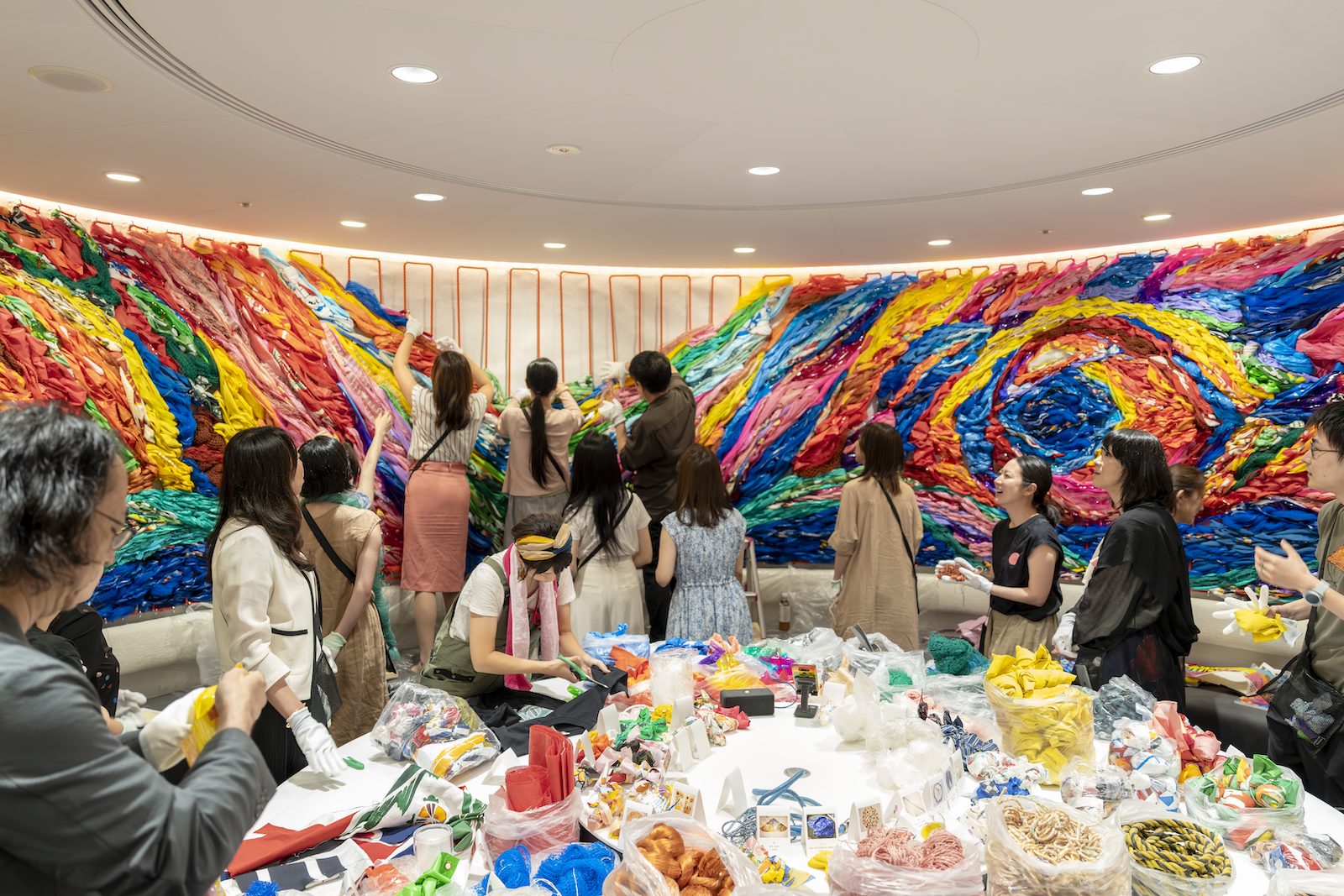 今回選出された鬼原美希さんは、綴れ織り作家として活動しています。世界中を旅しながら各国の「織る」文化に触れ、訪れた土地でのできごとや感情を織りの作品として発表しています。ART IN THE OFFICEでは、大漁旗の別名でもある《福来旗(フライキ)》を制作。壁面に経糸(たていと)を張り、6日間のライブ織りで作品を完成させました。緯糸(よこいと)には、全国の漁港や自治体などの協力を得て集めた、廃棄予定の大漁旗、漁網、ビニール傘などが織り込まれています。詳しくはこちら