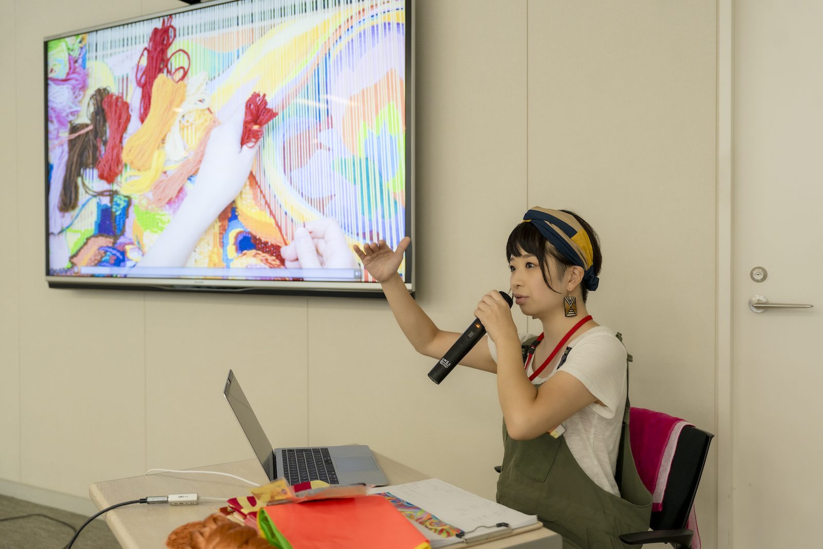社員との交流イベントでは、滞在制作の最終日に、マネックスグループに所属する20名の方々を迎え、ワークショップを開催しました。テーマは、「セッション」。プレスルームに展示される新作は、大きな目を持つ生き物をイメージしています。その生き物の「おでこ」にあたる部分を、参加者のみなさんと織り上げました。